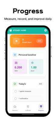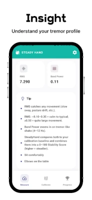 SteadyHand is a precision tremor analyzer and a fun steadiness trainer. Turn quick 15-second measures into progress you can see, and games that build real control.